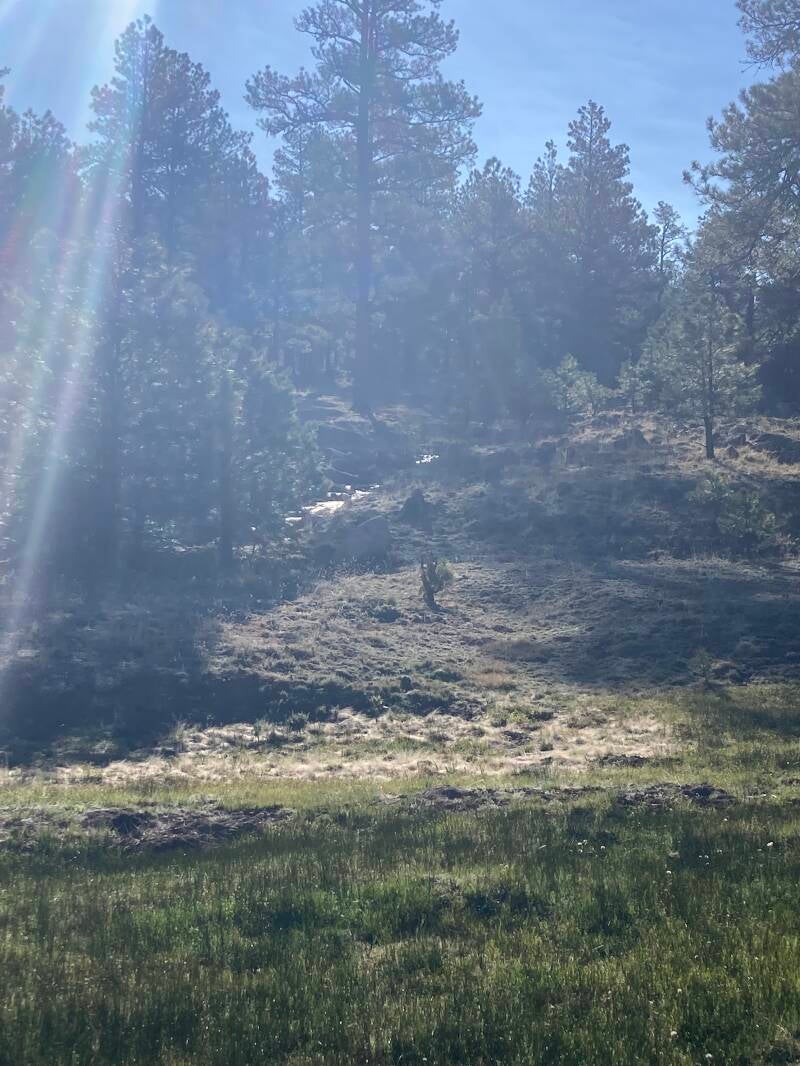 After miles and miles of beautiful forest and mountain-top meadows we abruptly entered into the Negrito Fire burn area. What a shock. Not sure when this fire was (without cell service I can’t look it up), but it devastated a large area. Snow Lake was on the other side of the burn and we decided not to stay, even though they had water at the campground. Instead we backtracked about 20 miles to a different campground called Gwynne Tank. Its only amenity is a vault toilet, but it’s a lovely small meadow with surrounding big pines and a tiny lake just over the rise. We can see and hear the trickle of water over the spillway that runs along one edge of the camp. We have been here 4 days so far and are the only campers here. We’re planning to stay put until Memorial weekend is past, another 4 days.