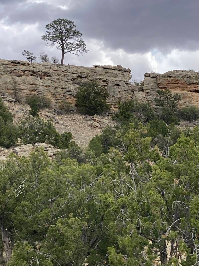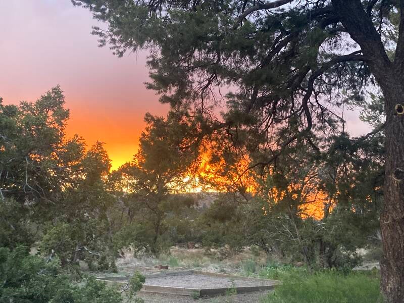 The road through El Malpais takes you to El Morro National Monument. This small park celebrates a tall sandstone bluff that contains petroglyphs and graffiti from long ago travelers through the area. They have a small, free campground with seven sites. For a free place, it was amazing— had trash service, water spigots, and a toilet. Sites were way too close together, though. You could sit at our picnic table and have a clear view of three other tables. And if I sat outside in my chair, I could hear entire conversations from the camp next door. A thunderstorm passed through on our first day at El Morro. By end of day the rain was over, but there were massive banks of clouds just above the horizon. The sunset that night was spectacular.