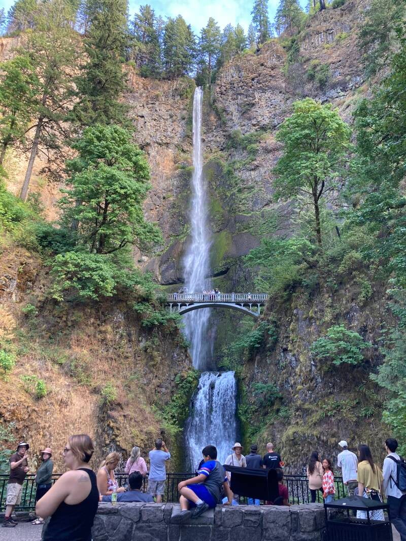 On Wednesday we drove to Oregon City to visit the End of the Oregon Trail museum. We went in and were watching a film about the native inhabitants of the Oregon territory. Dave told me he was incredibly tired and needed a nap. He went out to the van to sleep. I finished the films (there were two) and walked thru the museum displays and the heritage garden out in the museum grounds. When I went out to the van, Dave woke up and we drove out to the “Waterfall Corridor”, seeing many beautiful falls from the road and walked in a short ways to see Multnomah Falls up close. Then we drove east along the Columbia River and camped at Eagle Creek Campground for the night, surrounded by lots of big, old trees. On Thursday, we decided we wanted to head up to the San Juan Islands. We didn’t want to navigate through Seattle, though, so we decided upon a route that would take us around Seattle on the East and get us to Mt Vernon, where “maybe” there is a bridge from the mainland to the islands. If there’s no bridge, we’ll find the ferry. This alternate route required us to go quite a ways east before there was a bridge to cross the Columbia. Then we headed north/northwest to Yakima and on to Ellensburg, where Dave said he was beat. I found us a forest service campground (using the handy app), and we drove maybe 25 more miles to find it. It was a rustic little place in the forest. To enter the campground you had to ford a creek (it was paved with a few inches of water running across). We stopped there at 4:30 pm, ate, and went to sleep. I slept heavily, but Dave felt terrible and was up and down many times.
