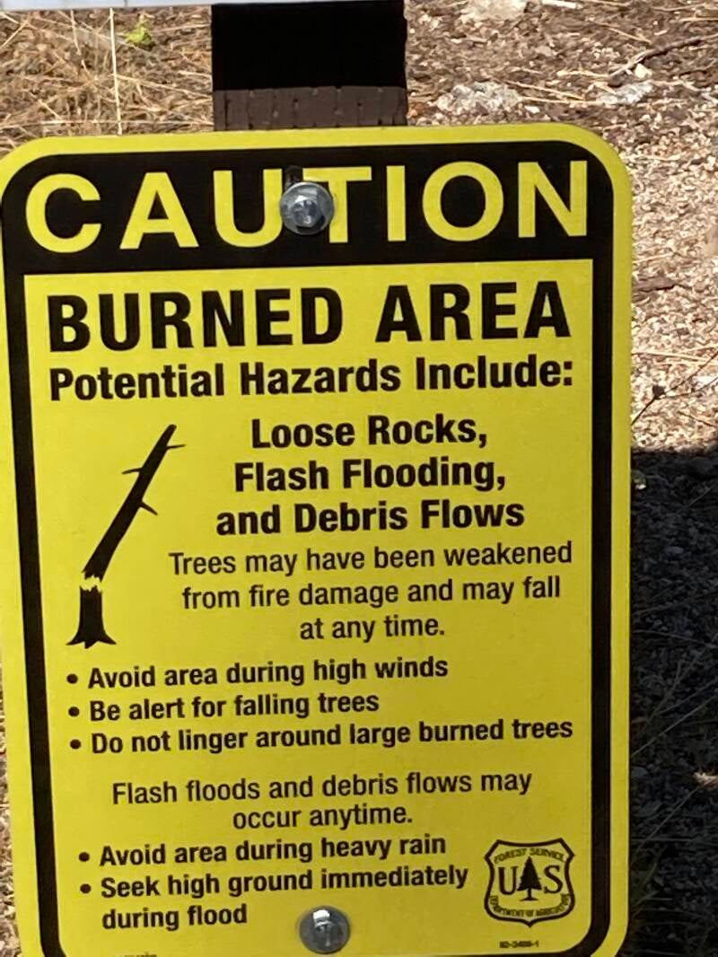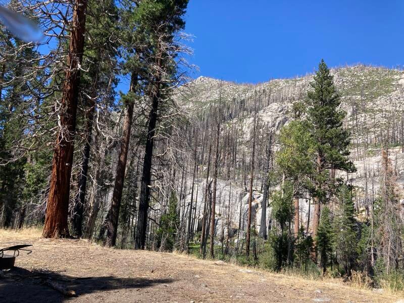 Still at Dardanelles but we moved to a different campsite. We were in site#26 but are now in #3. Still beside the river but further away from the Dardanelles Resort across the road. They run a BIG generator from about 7 am to 10 pm and the noise of it became annoying background sound pretty quickly. It's a lot harder to hear at this end of the campground. This site has better midday shade as well. There is no one here except us although I can hear occasional voices from over the road. Our view over the river is of a hillside of huge stones. A fire has swept down that hillside sometime in the past and burned all the trees. Looks like the fire was stopped at the river, so most of the trees on this side have not been burned. Some near the water have been badly scorched. We believe we have heard a couple of trees fall while here, and maybe a rock has crashed down as well.