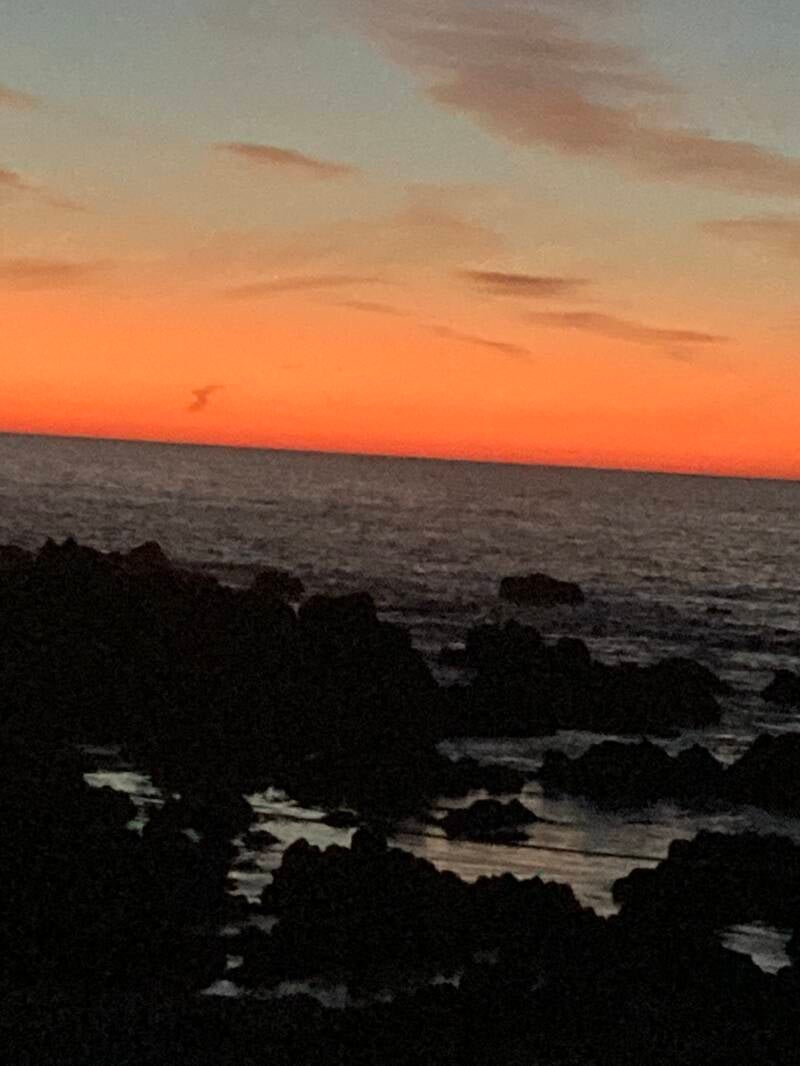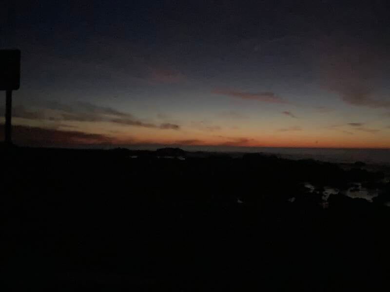 The sun slipped into the ocean horizon at 4:55 pm. And now at 5:38 the sky is a deep orange due to a slightly overcast sky. So gorgeous. For a moment, a V of pelicans flew high enough above the water to be silhouetted in the sunset. Too bad I missed that for a photo. The tide is slowly coming in, filling up the low spaces between the shore rocks. By 9 pm it will be an exceptionally high tide. It’ll be too dark here to appreciate it, though. At 5:49 pm the color suddenly faded from the sky with barely a hint left behind.