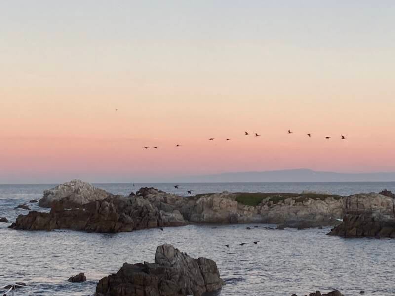 We are watching whales blow near the shore this morning. So exciting to see one after another send spray up into the air. Very occasionally we see the flash of a whale’s back, and once Dave saw a tail as the whale headed deep. We track the whale-watch boats coming toward us as they leave the bay and head into the open ocean. Since they have sonar to find the whales, we keep an eye on them and , sure enough, they have located a pod of whales. Water spouts randomly all over the place and the boats make a wide circle around the whales. Later the boats head back to the wharf and the water spouts can be seen moving further south.