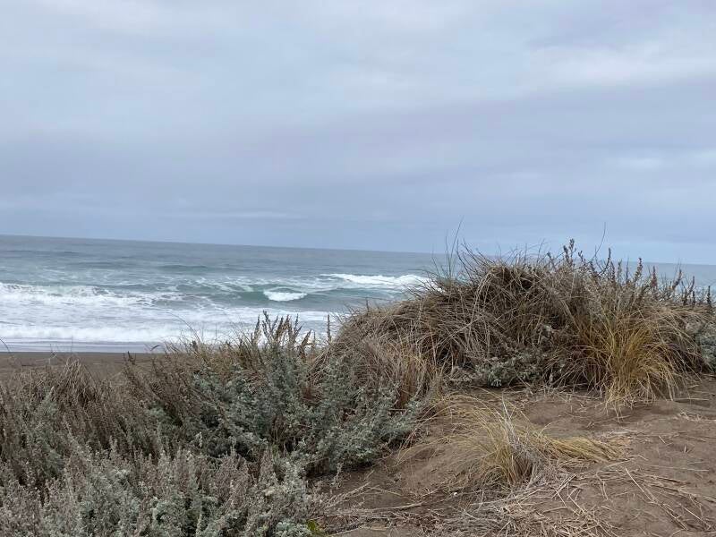 Slept in Fort Bragg again last night. Went again to the Headlands Coffeehouse. Different barista today. Same table full of local "old guys" having coffee, though. Headed south on Hwy 1. Stopped at Manchester State Beach and cooked sausage/egg/cheese English muffins inside the van! Throughout breakfast we could hear the surf booming. Hiked over the dune to the beach. Big surf crashing there.