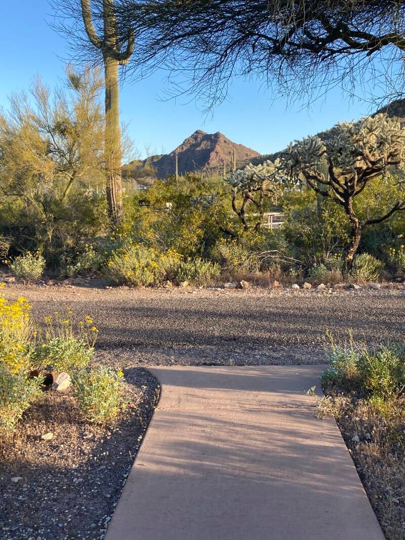 Besides the presentations (always using a slide projector), some interesting things have happened while we were at the amphitheater. This park borders the Barry Goldwater Proving Ground, which means that government jets fly over very low occasionally, sonic booms happen now and then, and guided missiles are tested. One evening, the talk had just started and the edge of the surrounding hillsides were still rimmed with a faint bit of sunset. Suddenly an audience member stood up pointing and shouted “Look, everyone, look over there!!” At first I thought it was a comet because of the bright tail behind it, but it was way too close for that. People started saying it was a rocket. The vapor trail behind it was strongly lit by the bit of sunlight that was still on the other side of the hills. It was spectacularly unusual. We watched it for a long time, then it made a guided turn away from the hills and the lighting of the vapor trail faded. It was amazing. That same evening a Great Horned Owl swooped down and dramatically glided low over everyone’s head, then turned into the dark and presumably landed in a tree outside the light. He was huge! And so close! There was a collective gasp of appreciation as he glided over us all. Since then we have heard that this owl often attends the lectures, usually perched high atop a nearby saguaro cactus. I hope we see him again.