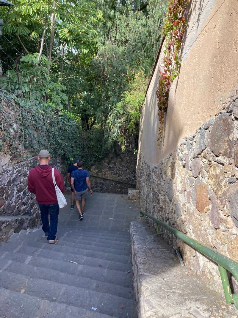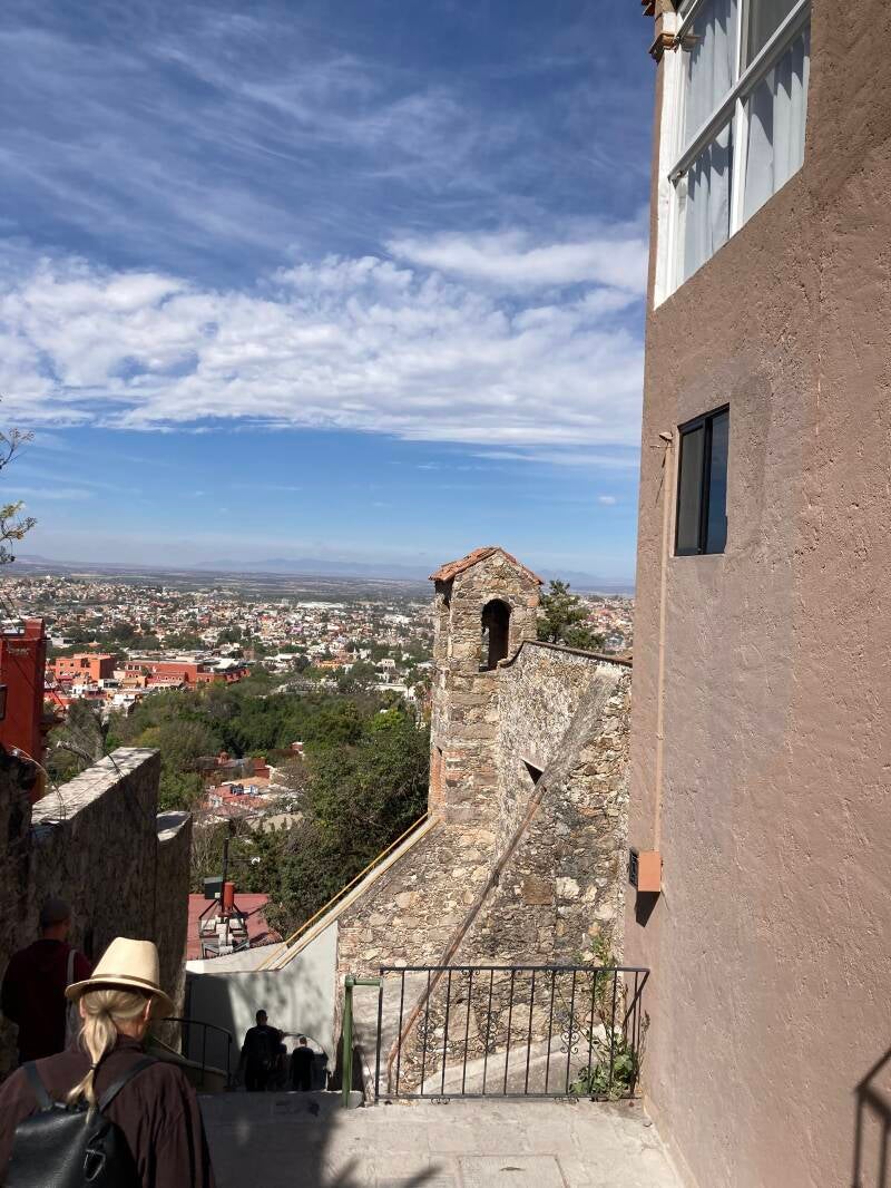 Dave and I walked down the steep stairway near the house to Benito Juarez Park last Sunday. The Candelaria was happening there—a huge collection of plant vendors, food stands, and indigenous music performances. One music group used a flute or whistle that sounded like the call of a jaguar—a bit unnerving, but very interesting. We went on to the downtown area surrounding the Jardín and the Parroquia. Tons of people around since it was the weekend. Sat in the Jardin for a while and people-watched. Found the butcher shop we had been to before and got some steaks and pork chunks for cooking. A couple from Manhattan flagged us down and inquired where Dave had gotten the Panama hat he was wearing. They were hoping to purchase one like it there in town. It was a hat borrowed from Nate, though, so even though it was probably purchased locally, we couldn’t tell them where. I bought a lovely hand sewn and embroidered blouse at a small shop, then we huffed and puffed our way back up the steep stairs to Nate’s house. A 17-member mariachi band was playing at a tiny park on the way up. We rested a few minutes there, One of the songs they played was “Orange-Blossom Special” (a classic bluegrass tune) done with a Spanish flair! Bought a couple of coca-colas at a tienda at the top of the stairs to revive us. It was a great walking adventure.