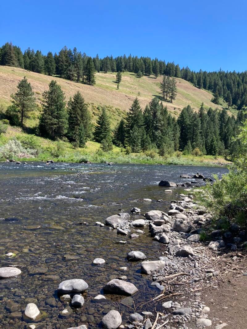 Drove through the morning over many miles of hilly wheat fields, not a tree in sight. Lovely drive. Had breakfast in Walla Waslla, WA. Had to go to Starbucks because the “good” place in town (according to YELP) was insanely busy. I couldn’t wait, had to have something NOW. The downtown Walla Walla area was a very pleasant pedestrian area. The day was beginning to heat up. From Walla Walla we went south down into Eastern Oregon again. Then, before Pendleton, we turned east at Weston and drove back into wooded parkland. Using the Forest Service app, we found a “dispersed camping” location on BLM land. We found it after a bit of driving, and pulled up beside the Grand Ronde River. Spent the afternoon parked at the top of the boat launch, since the other campsites were occupied. The ranger came by to chat. He said we could stay where we were to camp, OR there was another camping spot on the river very nearby. After he left, we moved to that other spot. It was lots more secluded and an even better/closer view of the river. We are staying here tonight.