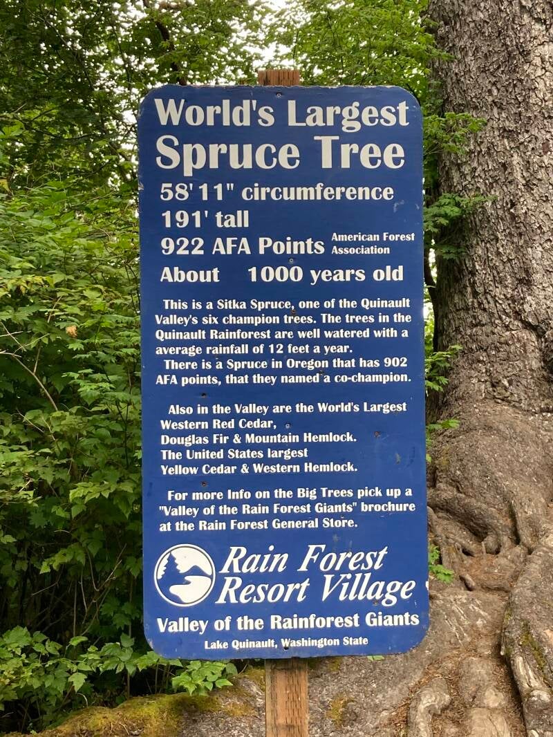 Got back on Hwy 12, drove west until it joined I-5, then went north to join Hwy 12 again when it went west. Drove on 12 out to Aberdeen, Washington, then got on Hwy 101, which makes a complete loop around the Olympic Peninsula. Went to the town of Quinnault inside the National Park. All Forest Service campgrounds were full (or you had to walk into your campsite, which doesn’t work too well when you’re sleeping in your vehicle) so we stayed at a private RV park down the road. It had water and electrical hookups, so it was expensive compared to the campgrounds. Our parking spot was next to the “world’s largest Spruce tree”. It was a Sitka Spruce, 191 feet tall, 59 feet circumference, and estimated to be about 1000 years old. It was humbling to be sleeping next to such a giant. Across the road was a general store, laundromat, and pay showers, one minute per quarter. I needed 7 minutes.