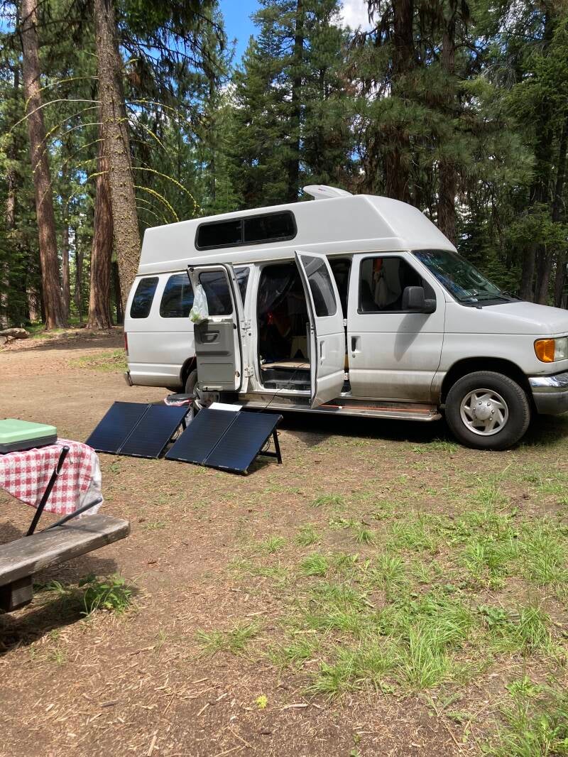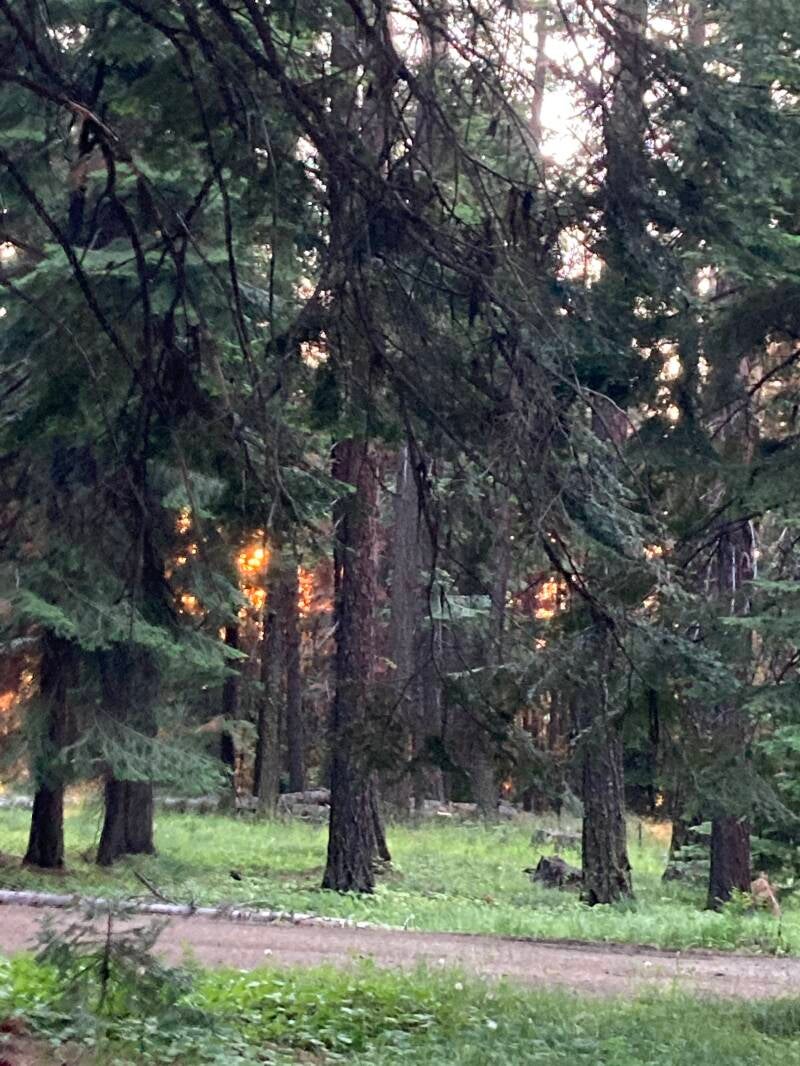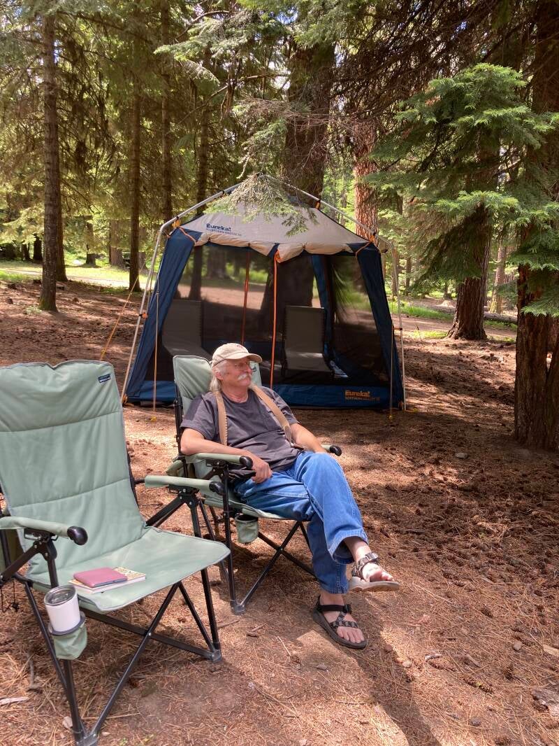 Still at Barnhouse. It’s calm and generally cool here, although today is our hottest day so far. I am journaling in the tent after writing postcards to all the grandkids, and Dave is sitting outside in the shade playing guitar. We have the solar panels out and also have the black shower bag out in the sun. Hoping to have hot water for a body rinse off later. My deep cough like I had in Tahoe is back. We’re thinking maybe the particular kinds of pine trees here are bothering me. Will probably leave tomorrow for a diferent spot. Some cottonwood groves are listed nearby on the map. We’ll see what we can find. I used the nebulizer twice yesterday. It helped a little.