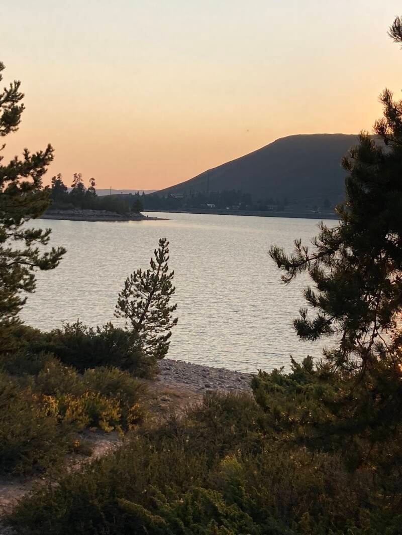 Tried to do laundry, but the only place in town was locked up tight. Went on to Steamboat Springs, did laundry and grocery shopped. When we drove out of town I had a campground in mind that was about 20 miles away. For one reason or another we rejected all the next few campgrounds--—no shade, I believe. Fewer trees here. Eventually we drove all the way south to the Arapaho National Recreation Area (also a wildlife refuge). We camped on the shores of Granby Lake, southern tip of Rocky Mountain National Park. Place called Sunset Point Campground. Beautiful and cool temperatures. Really lovely view of the lake.