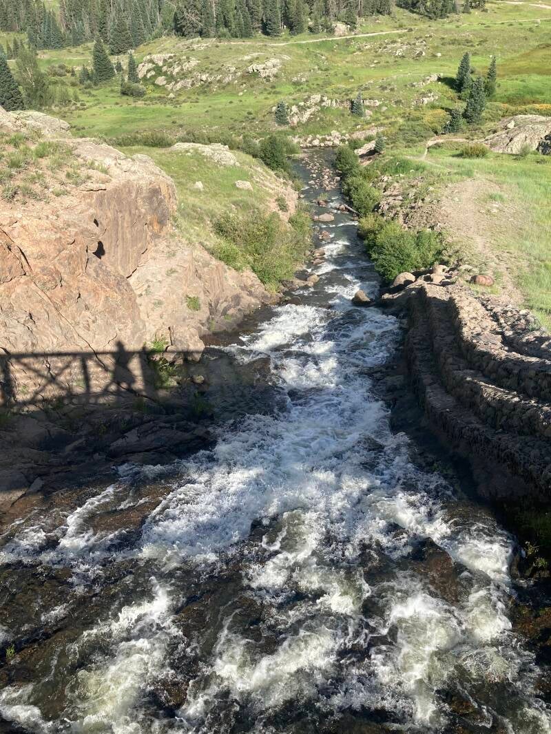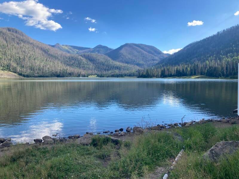 Left Teal Campground today, Looked at a few other campgrounds before we picked this one–Big Meadows Reservoir and Campground. We are at 9276 feet elevation. We just crossed the Continental Divide at Wolf Peak Pass (10,856 elevation), so now we are camping on the east side of the divide instead of the west. Our site is elevated a bit above the lake, but it’s a pretty close view. We are in a valley beyond a canyon. The reservoir just about fills the valley, with camping on this SE side of the lake. When we first got here all the signs were that a thunderstorm was imminent. So we didn’t take anything out of the van. Decided to wait till the rain was past. But it’s been about an hour and the storm wind and the thunder have come and gone. The storm seems to be veering northward. It seems a little drier here on the eastern slope. I wonder if the clouds hold their moisture until they’re over the top then dump it all on the western side. We shall see.