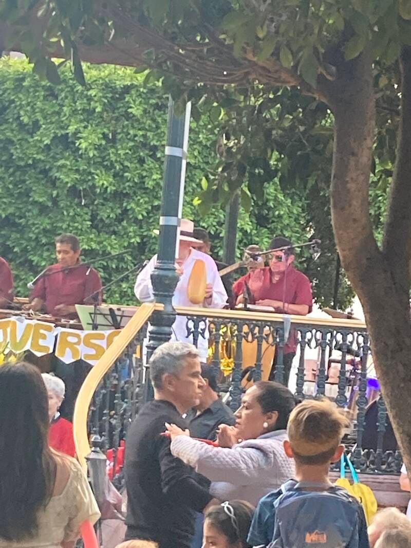 Leaving the restaurant and walking toward the Jardin, we saw two of the local giant puppets walking around, plus a band with a large rhythm section (congas) playing in the central bandstand. The music was soothing, and people were gently dancing as many others watched.