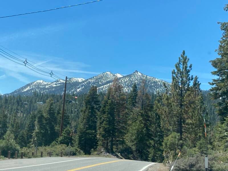 Slept last night at William Kent Campground just outside Tahoe City. Realized we weren't packed appropriately for putting items into a bear box quickly. We'll have to work on it. Had coffee and pastries this morning at a little gourmet bakery/grocery in Tahoe City. Met "Mr. Tahoe", a tour guide who was very personable. Drove past Emerald Bay on Lake Tahoe--a gorgeous place with a big waterfall.