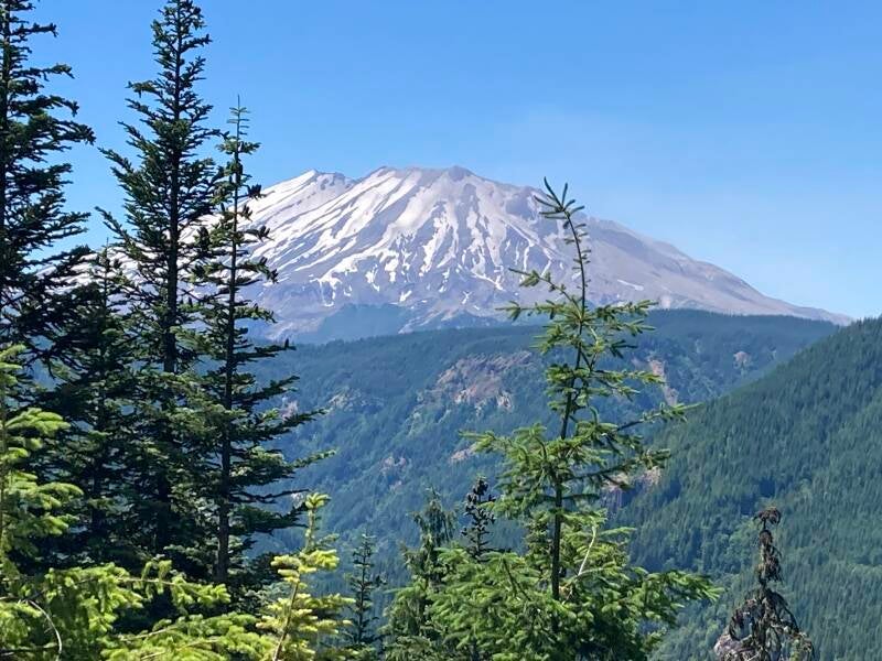 Before leaving the Deschutes River Rec Area we filled up with water. Drove to The Dalles and fueled, fought the wind as we drove along the Columbia River. We crossed the Columbia on an exremely narrow toll bridge at Hood River. Looking back at Oregon from the Washington side, we saw Mt Hood. It was spectacular. Then we turned away from the Columbia and headed north into Washington. Drove through Indian Heaven Wilderness towards the Mt. St. Helens volcano. We drove around a little extra because the roads were poorly marked (translation: we got lost), The volcano was astonishingly large and snow-capped, standing out so obviously from everything else. We had planned to stay at Iron Creek Campground down the road from the volcano, but the place had a very negative vibe. It was really dark and gloomy with lots of heavy moss hanging off the trees. We agreed we didn’t want to be there and moved on. Went toward Mt. Ranier National Park. Saw the mountain, but did not tour the park. Seemed to be lots of visitors around. We found Forest Road 46 and located an off-shoot dead end with a fire ring and a hand made table of a stump and a slab of concrete in front of a mossy dell of slim lodge-pole pine trees. Spent the night here. Very quiet spot.